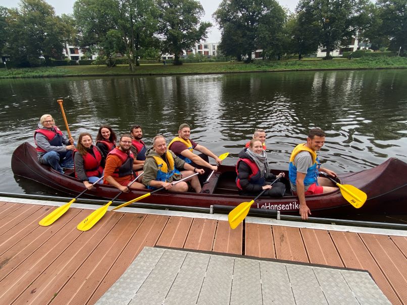 Das Nachmittagsprogramm beinhaltete eine sportliche Kanufahrt um die Lübecker Altstadtinsel im Rahmen der Erlebnispädagogik. Bei angenehmen Wetter und mit bester Laune saßen die Teilnehmer:innen des Netzwerktages in einem Kanu für bis zu zehn Personen und haben gemeinsam unter der Leitung von Anne Schmundt gepaddelt. Auf diese Weise wurden Spaß, Sport und Teamwork kombiniert. Der Tag schloss mit einem freundlichen Beisammensein im Kanu Club Lübeck ab.