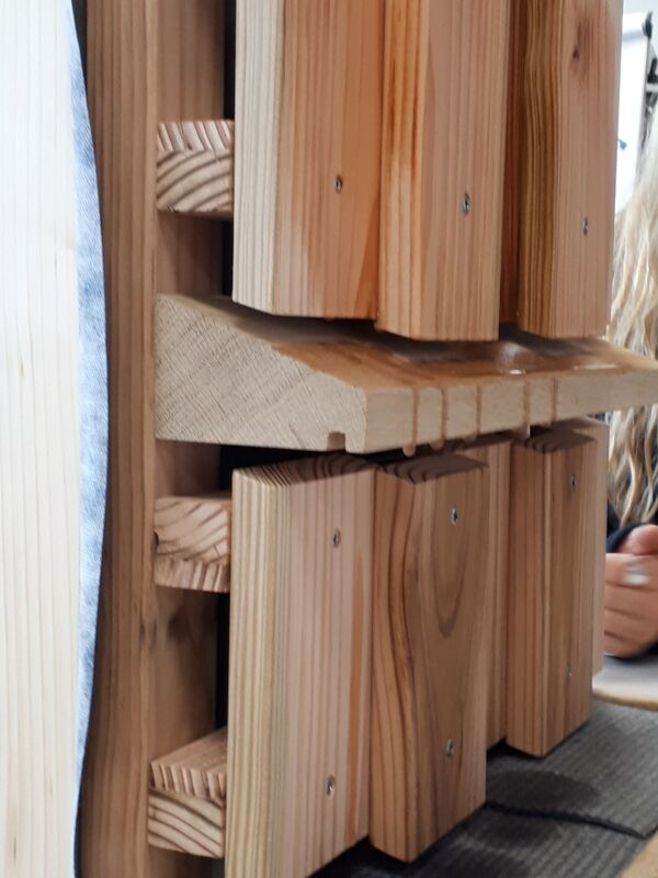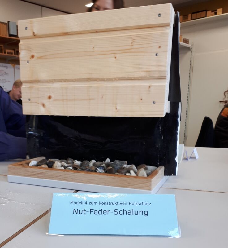 Um den Lernenden einen explorativen Zugang zu diesem Thema zu ermöglichen, hatte Frau Voigt sechs Modelle von Fassaden- und Terrassenanschlussdetails vorbereitet, die jeweils eine fachlich richtige und eine fehlerhafte Seite aufwiesen. Motiviert durch die Modelle und ausgerüstet mit Sprühflaschen untersuchten die Lernenden das Wasserabtropfverhalten und identifizierten die Modelle auf Konstruktionsfehler. Durch die offene, forschende Arbeitsweise wurden fachliche Inhalte mit praxisorientiertem Denken eindrucksvoll verknüpft. Dabei wurde deutlich, wie wichtig konstruktive Maßnahmen wie zum Beispiel Hinterlüftungen, Gefälle und die Berücksichtigung von Spritzschutz für die Dauerhaftigkeit von Holzkonstruktionen sind. Die liebevoll vorbereiteten Modelle werden die Lernenden zukünftig – auch ausbildungsübergreifend – unterstützen, sich diesen Themenbereich aktiv zu erschließen. Die Methode des explorativen Lernens förderte sowohl die fachliche Auseinandersetzung als auch das selbstständige Denken und Handeln der Lernenden.