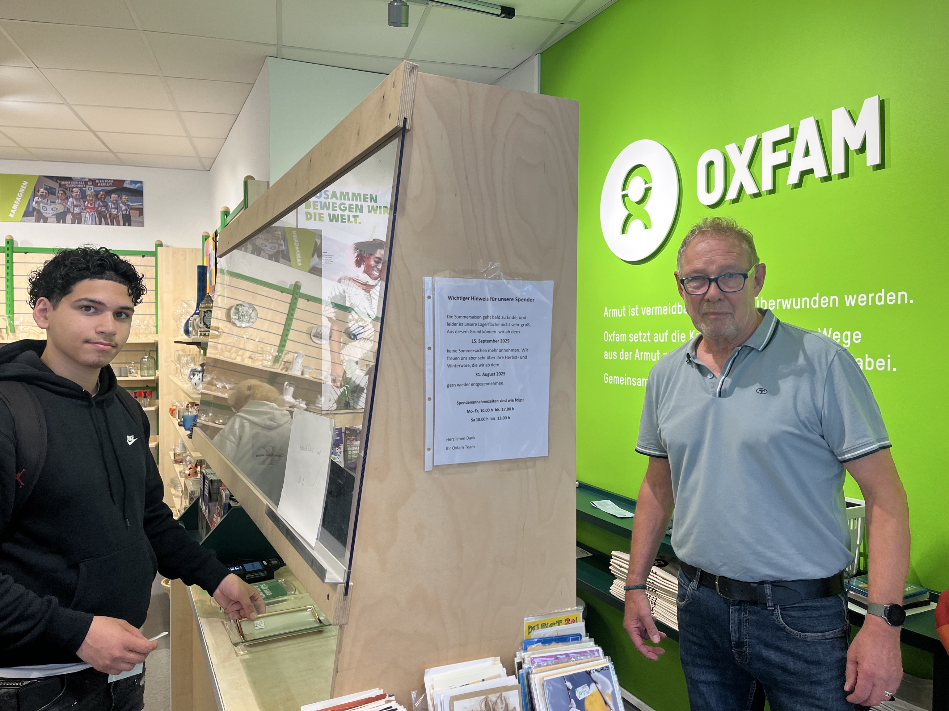 Talal bezahlt an der Oxfam-Kasse, rechts im Bild Shopleiter Frank Prüssmann.
