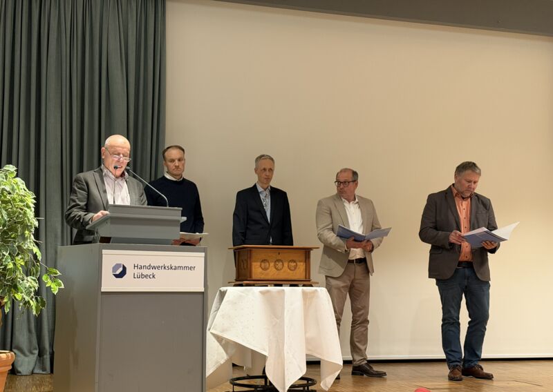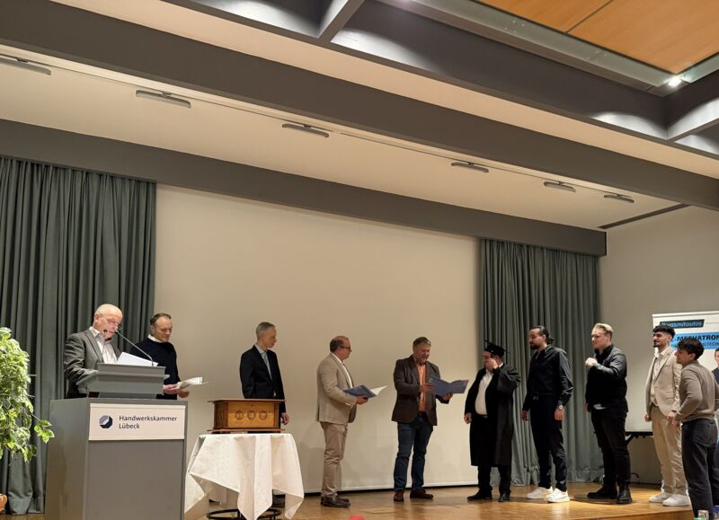 Traditionell fand die Freisprechungsfeier der Kfz.-Mechatroniker/-innen mit dem Schwerpunkt Personen- und Nutzfahrzeugtechnik im Festsaal der Handwerkskammer Lübeck am 13. Februar 2026 in der Breiten Straße statt. Mit herzlichen Grußworten hieß Dirk Schönberg, stellvertretender Obermeister der Kfz.-Innung Lübeck, die Junggesellinnen und -gesellen mit ihren Eltern, Freunden und Ausbildern willkommen.